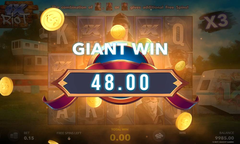 1X Riot fue lanzada a mediados de otoño de 2024 por el estudio Mascot Gaming. Forma parte de una serie de varias tragaperras Riot de temática postapocalíptica. Tiene un campo pequeño, varios tipos de tiradas gratuitas con diferentes funciones de bonificación y una mecánica de pago por línea clásica. Hay una ronda de riesgo. El límite de ganancia es relativamente pequeño y es x1500.