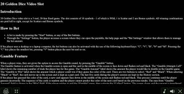 Al iniciar la tragaperras en línea 20 Golden Dice, vale la pena ir directamente al menú. Tiene ajustes para autopins y efectos de sonido, tabla de pagos, descripción de características y reglas del aparato. Después de leer la información, puede iniciar el juego: