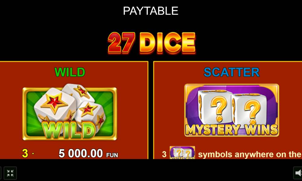 Al entrar en la tragaperras online 27 Dice, el usuario ve los rodillos y los botones de control. Puede iniciar el juego inmediatamente o después de familiarizarse con las reglas de la máquina (situadas en el menú - tres barras horizontales). Una vez estudiada la información necesaria, es fácil iniciar el entretenimiento: