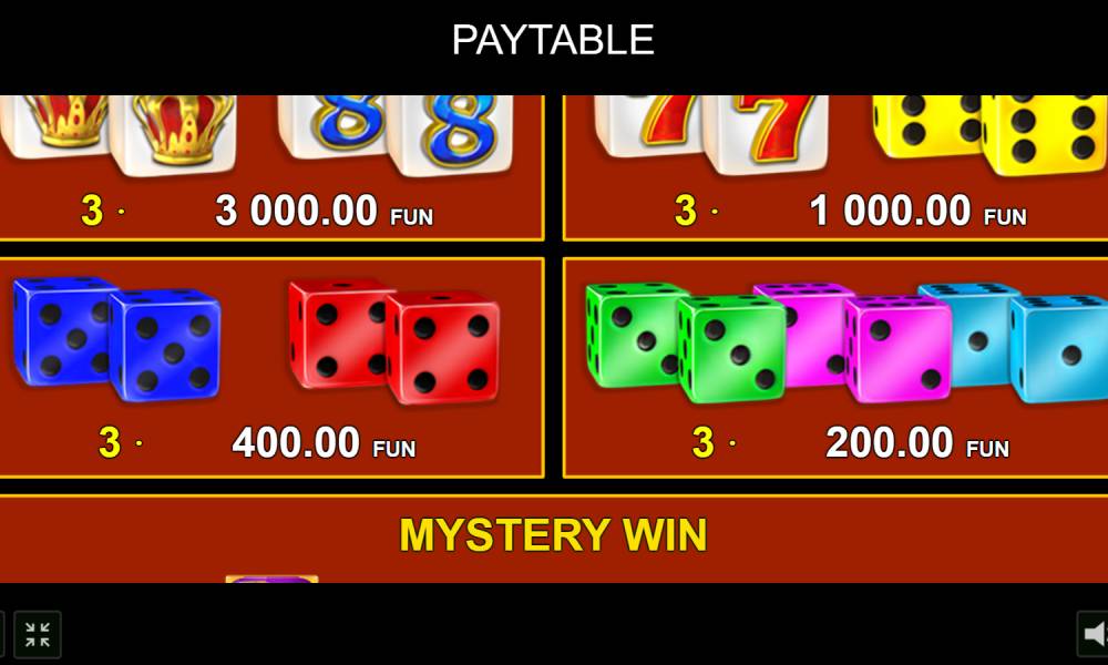 | La tema | Ranuras clásicas, Suerte, Acción, Lujo, Derechos, Casino, Dinero, Juegos de dados |
