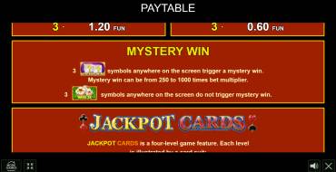 Premio Misterioso. Cuando aparece al menos un símbolo Scatter en los tres rodillos, el jugador recibe inmediatamente un gran premio. Se elige aleatoriamente entre x250 y x1000 de la apuesta.