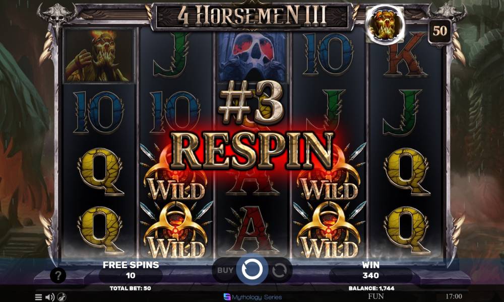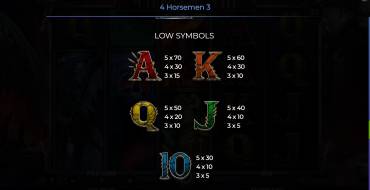 El campo de juego en 4 Horsemen III es de 5x4 y hay 50 líneas ganadoras fijas. Los símbolos salen en forma regular y estirada. Hay un total de 2 símbolos especiales y 10 símbolos de fila. Para hacer combinaciones se requiere la ubicación de 3 símbolos idénticos como mínimo, del rodillo izquierdo al derecho. El rango de apuestas es muy amplio, de 0,5 a 500 euros. Las ganancias máximas están limitadas a x900 de la apuesta. La tragaperras ofrece bonificaciones en forma de tiradas gratuitas con respins. La volatilidad media simplifica enormemente la jugabilidad.