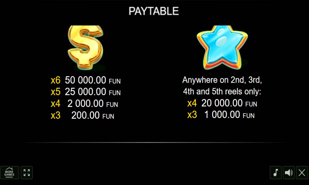 Símbolo Scatter imagen de un dólar - se detiene en todos los carretes. Pagado por 3-6 piezas, y que puede estar ubicado en cualquier lugar.