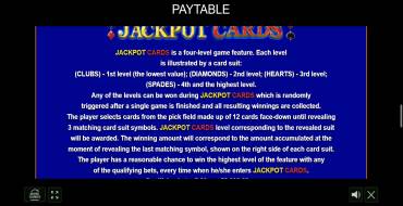Para más emoción, el proveedor ha añadido una ronda de bote a la tragaperras 40 Lucky King. Hay cuatro tipos de ellos y corresponden a los palos de las cartas: tréboles, diamantes, corazones y picas (en orden ascendente). Los premios sólo tienen valores mínimos y máximos. Después de obtener una ganancia, el bote siempre se reinicia y luego crece gradualmente. La ronda de Jackpot Cards comienza en un momento aleatorio. Se colocan doce cartas en el campo con la camisa hacia arriba. El usuario debe hacer clic en ellas en orden aleatorio hasta encontrar tres idénticas. El palo de estas cartas indicará el tipo y el tamaño del bote. Se pagará inmediatamente al jugador.