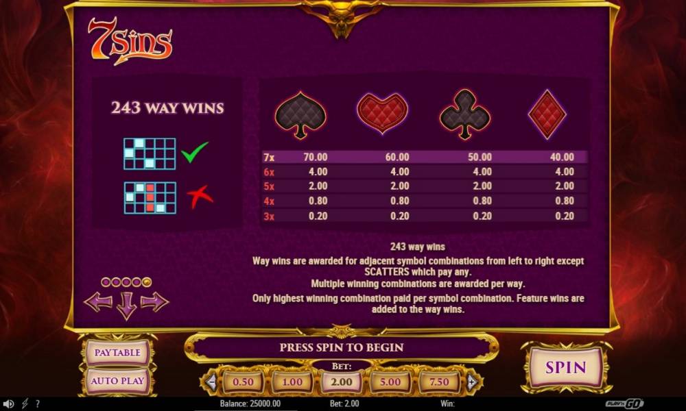 En 7 Sins se juega en un campo con 5 rodillos en 3 filas. Las líneas ganadoras se presentan en un gran número - 243, todas ellas activas. Las apuestas se pueden hacer en el rango de 0,10-100 euros. Para ganar se requiere la caída de símbolos idénticos en los rodillos vecinos en el número de 3 a 5, y en el juego de premio - hasta 7. El recuento se realiza de izquierda a derecha desde el primer rodillo. Si hay varias combinaciones ganadoras, se suman las sumas. La cuantía de los pagos depende de los símbolos recogidos en la línea, que se dividen en de pago alto y de pago bajo (palos de cartas) y tienen coeficientes diferentes. La ganancia máxima es x1580 a la apuesta y alcanza los 158.000 euros.