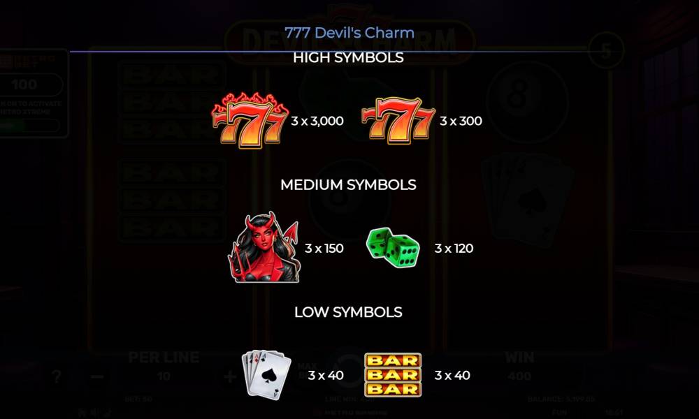 El campo de juego de la tragaperras 777 - Devil's Charm incluye tres rodillos, cada uno de los cuales tiene una altura de tres casillas. En el juego intervienen siete símbolos normales y uno con características especiales. El tamaño de la apuesta puede establecerse hasta 50 euros, pero al activar Retro Bet se duplica. Cabe destacar que sólo un símbolo, el 777, obtiene un multiplicador de ganancia adicional. Reglas sencillas y claras en suma con una volatilidad media - complementan perfectamente el estilo retro del juego, haciéndolo accesible incluso para principiantes en el entretenimiento del juego. No hay tiradas gratuitas ni otras bonificaciones.