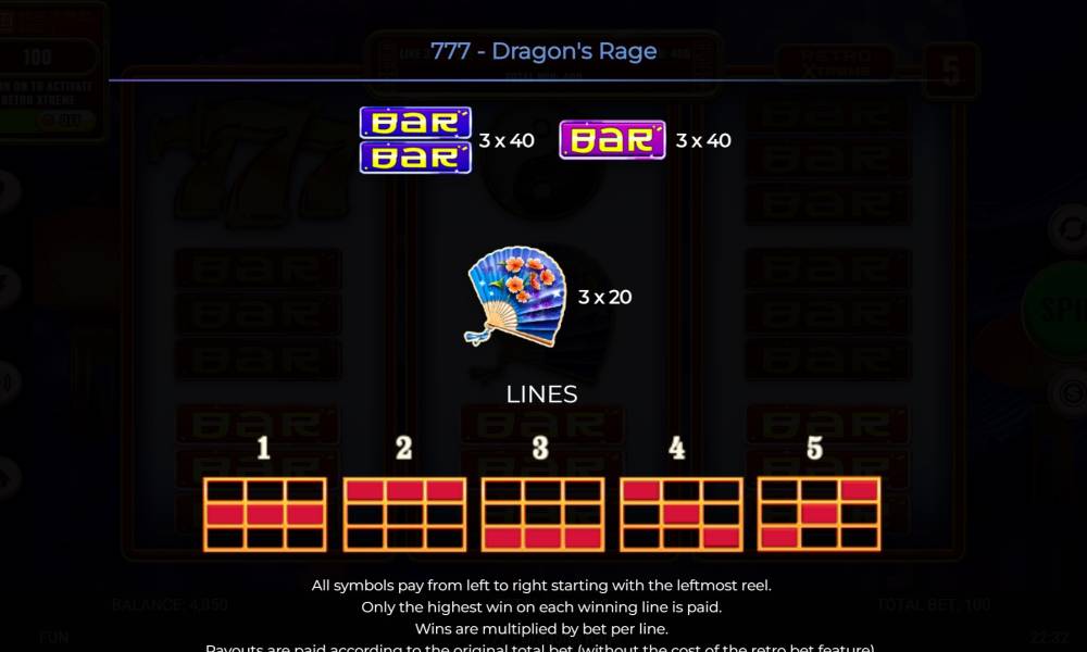 El 777 - Dragon's Rage tiene reglas extremadamente sencillas. El campo de juego es clásico, 3x3. Tiene 5 líneas fijas para hacer combinaciones. No se proporcionan opciones especiales para combinar símbolos, porque la ganancia trae sólo 3 idénticos en una fila. No hay símbolos especiales en la tragaperras, y hay un total de 8 símbolos en los rodillos. Las tiradas gratuitas y otras bonificaciones comunes no se realizan. La única característica es aumentar el tamaño de la apuesta, lo que automáticamente mejora el signo mayor 777 a oro y aumenta las ganancias de la misma a x3000. El propio jugador controla la apuesta y puede elegir entre un rango de 0,05 euros.
