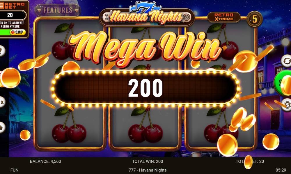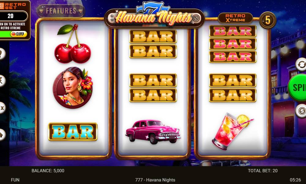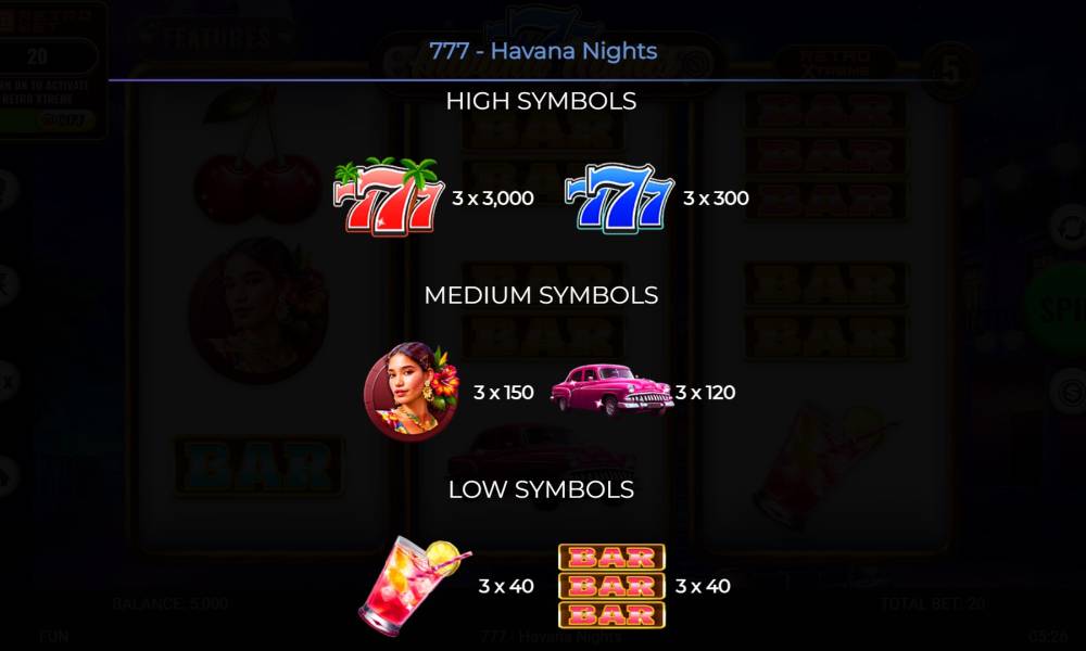 La tragaperras 777 - Havana Nights tiene reglas muy accesibles que no tendrás que entender en mucho tiempo. La mayoría de ellas son familiares para los aficionados a las tragaperras retro. El campo de juego es de 3x3 con 5 líneas de pago y sólo 8 símbolos. Las combinaciones se cuentan una vez por línea, requiriéndose 3 símbolos idénticos para formarlas. El rango de apuestas de 0,1 a 100 euros con volatilidad media satisface a la mayoría de los jugadores e incluso a los principiantes. No hay tiradas gratuitas con respins. La única bonificación la proporciona la función Retro Extreme.