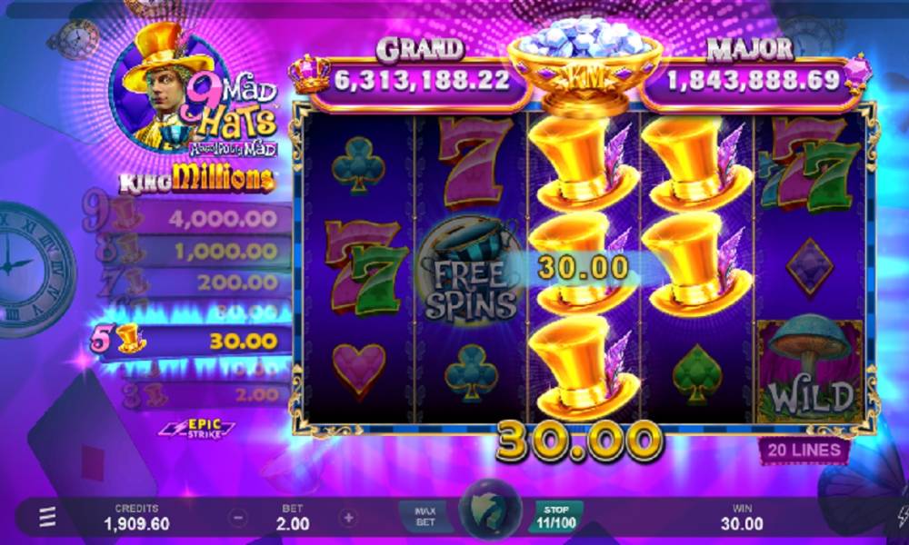 La tragaperras 9 Mad Hats King Millions, presentada por Triple Edge y Gameburger Studios, añade una característica única de múltiples jackpots progresivos al muy querido juego base basado en "Alicia en el País de las Maravillas" con la posibilidad de una ganancia verdaderamente real. El Sombrerero Loco de los libros mágicos de Lewis Carroll tiene un aspecto aún más simpático y mejora invariablemente el ambiente.