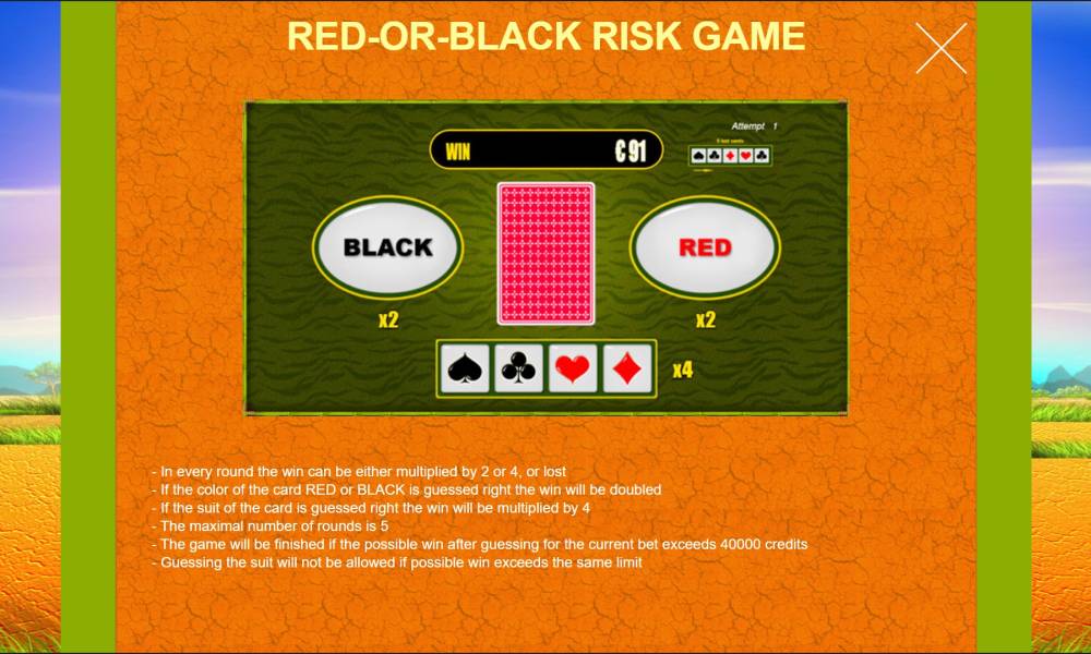 La tragaperras Africa Gold tiene 10 líneas de pago fijas en un campo de juego de 5x3. Un excelente rango de apuestas de 0,1 € a 20 € permite incluso a los principiantes jugar con una volatilidad media. Las ganancias máximas están limitadas a x4000 de la apuesta. El juego tiene 11 símbolos normales y 2 especiales. Hay bonificaciones en forma de tiradas gratuitas con un multiplicador estable x3. La tragaperras también participa en los sorteos de jackpots del proveedor. Las combinaciones están formadas por tres símbolos seguidos, de izquierda a derecha.
