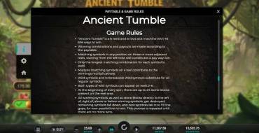 En el Ancient Tumble las tiradas gratuitas se pueden comprar (en la función Comprar por x50 y x400) o ganar (destruyendo todos los bloques vacíos en las tiradas simples). En ambos casos, se dan 6 tiradas, que pueden aumentarse atrapando bonificaciones en el campo. Hay 5 tipos de tiradas gratuitas: Classic (funcionan como las tiradas normales pero dan más premios), Coin (además de símbolos en el campo aparecen monedas con números aleatorios que se pagan), Colossal (los símbolos en el campo pueden tener un tamaño aumentado de 2x2 a 5x5) y Multiplier Ladder (después de cada ganancia hay un multiplicador adicional que funciona en el siguiente respin y crece, siempre y cuando en los respins vuelvan a aparecer premios, pudiendo llegar hasta x100).