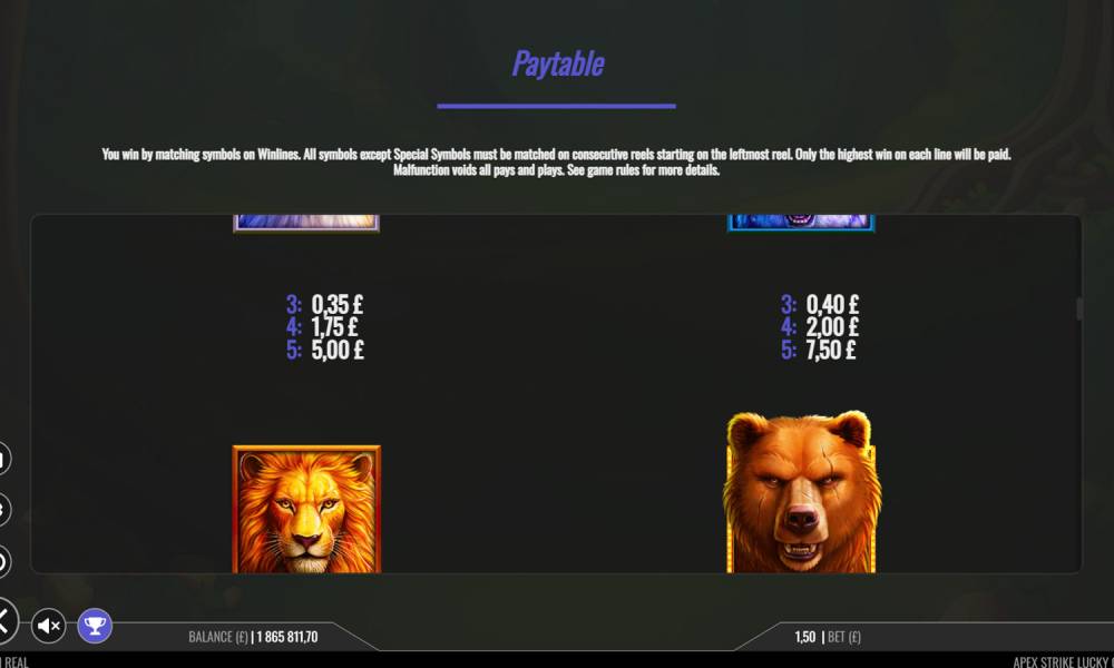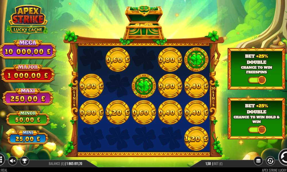 La video tragaperras Apex Strike Lucky Cache cuenta con 5 rodillos en 4 filas y 30 líneas de pago fijas. Durante la duración del juego de bonificación, el campo se amplía a 5x8, con 4 filas adicionales al inicio de la ronda cerrada. Para ganar es necesario reunir 5 símbolos idénticos de forma que se sitúen en los rodillos en secuencia desde el borde izquierdo hacia la derecha. Las apuestas pueden elegirse entre 0,20 y 25 euros. El límite de pago es x10.000 a la apuesta. Si aparecen 3 o más símbolos idénticos, se aplica un multiplicador a la apuesta. Los valores del multiplicador se muestran en la tabla de pagos. La multiplicación máxima x12,5 a la apuesta da el premio de 5 Wild. Los Scatters sólo se pagan por 3 de ellos en rodillos diferentes.