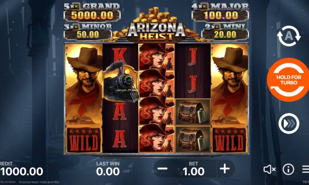 La tragaperras Arizona Heist: Hold and Win del conocido proveedor Playson cuenta la historia de unos afortunados ladrones que decidieron hacer de un tren su próximo objetivo. El dinero transportado no tiene número y un premio tan atractivo merece cualquier riesgo.