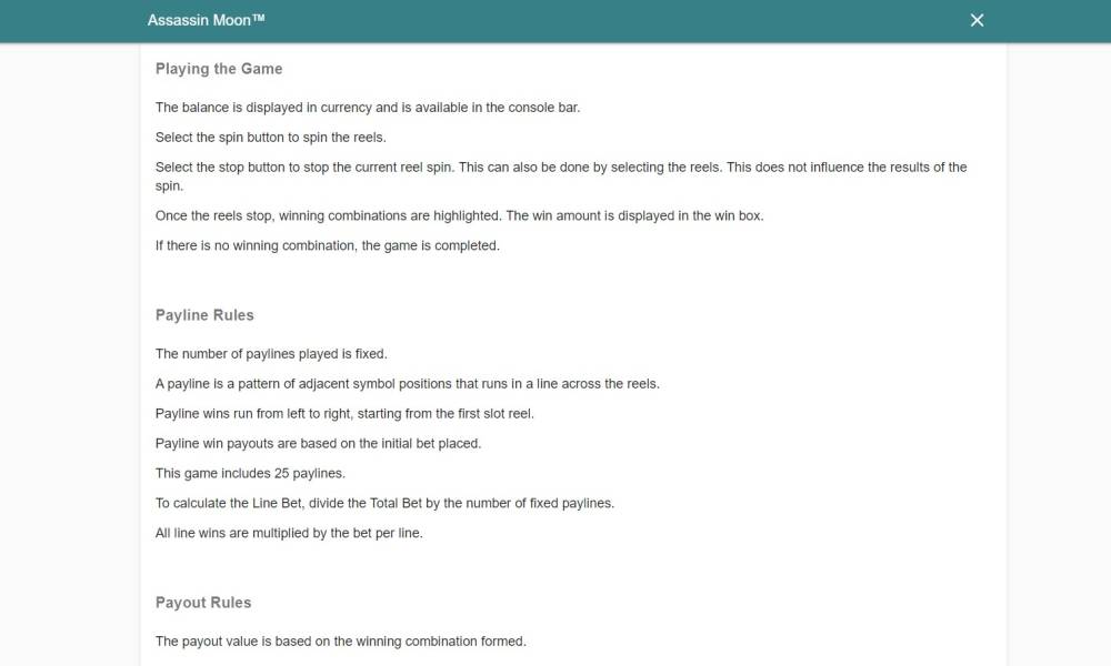 Analice la tabla de pagos y, sea cual sea el juego Assassin Moon al que juegue, asegúrese de conocer las características y funciones de la tragaperras como la palma de su mano.