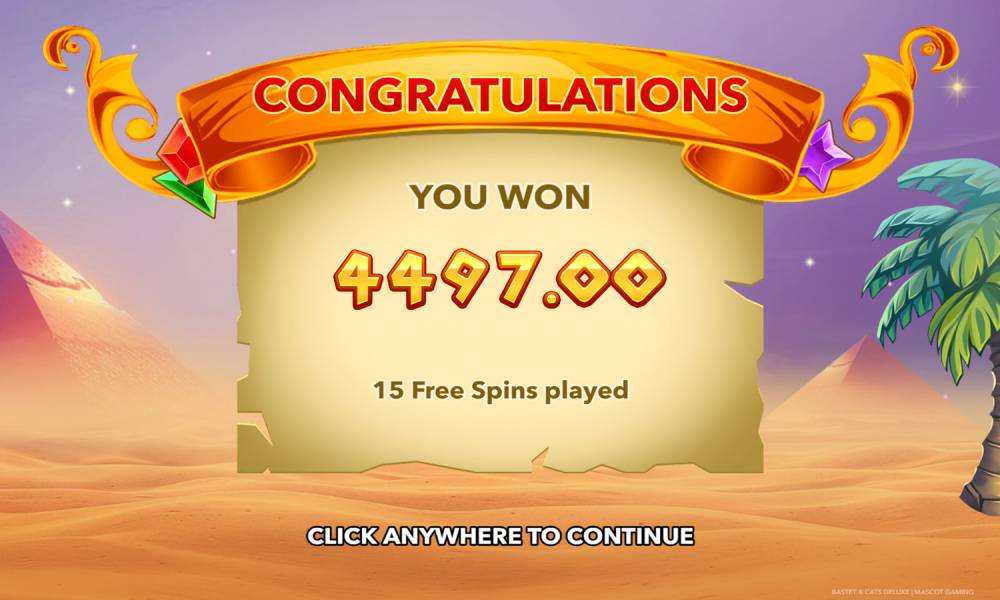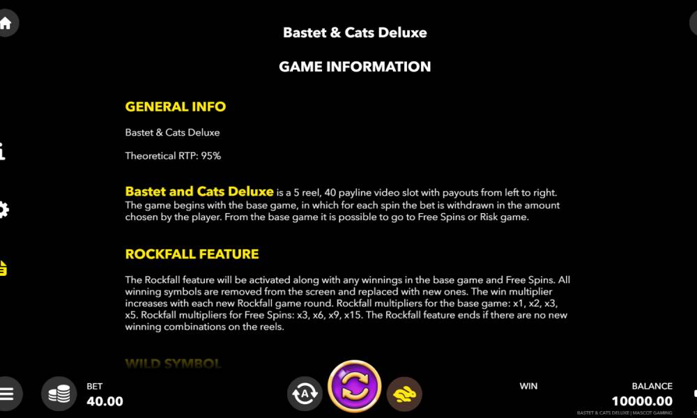 La tragaperras Bastet and Cats Deluxe está dedicada a Bastet, la diosa con cabeza de gato venerada en el antiguo Egipto. El desarrollador Mascot Gaming la lanzó a principios de noviembre de 2024. Los pagos de la tragaperras funcionan línea a línea y activan cascadas con un multiplicador adicional creciente por cada ganancia de la serie. Hay una ronda de riesgo en la que puedes aumentar tus ganancias con un multiplicador de hasta x1000 de tu apuesta. Me ha gustado que el paquete de tiradas gratuitas tenga muchas tiradas (15).