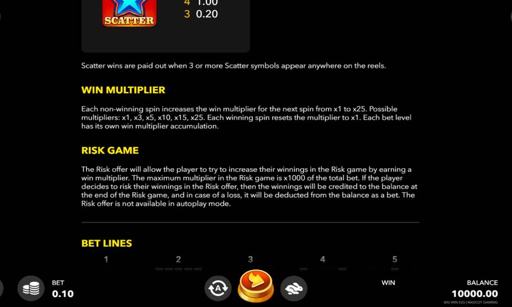Big Win X25 tiene un funcionamiento minimalista muy sencillo. Hay 5 rodillos en 3 filas, 9 símbolos participan en el juego (de los cuales 2 son especiales, pero sólo uno de ellos tiene una propiedad especial). Las ganancias se forman en 5 líneas fijas que pagan en ambos sentidos. La línea debe incluir al menos 3 símbolos en fila. Ambos especiales pagan sin líneas.