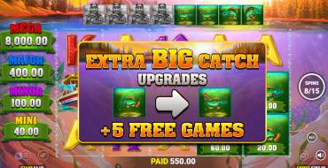 Tiradas luminosas. La función se activa cuando aparecen 4 o más símbolos Lighting Spin en el campo. El jugador obtiene tres respins, que se reanudan cada vez que cae un pez en los rodillos. Sólo los símbolos Lighting Spin y Wild pueden detenerse durante la ronda. Estarán pegados hasta el final de los respins. Si un pescador dorado cae en el campo, ofrecerá al usuario una elección. Tienes que golpear a uno de los peces y conseguir un multiplicador de hasta x10. Se aplicará a las ganancias actuales. Los pescadores también recogen valores de los peces. Al final de la ronda, se suman todos los premios y se pagan al usuario. Si se tiene la suerte de llenar los rodillos con 15 símbolos, se aplicará un Multiplicador aleatorio - x2, x3, x4 o x5 - a las ganancias totales.