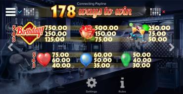En los rodillos de la tragaperras aparecen largas pilas verticales de globos de colores, cócteles festivos, rosas rojas y logotipos de cumpleaños.