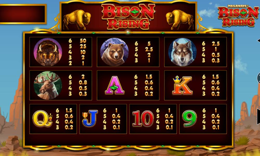 La tragaperras Bison Rising Megaways tiene 6 rodillos verticales y 1 horizontal compuesto por 4 casillas. El número de líneas de pago puede llegar a 117649, pero no es estable. Esto se debe al hecho de que el número de celdas en los rodillos cambia todo el tiempo. Esto se denomina mecánica de Megaways y permite a los usuarios obtener grandes pagos (máximo x10000 de la apuesta por tirada). El juego utiliza símbolos de cartas - 6 símbolos junior y animales salvajes - 4 símbolos senior. Todos ellos dan un pago por 3-6 símbolos en la línea, empezando por el rodillo más a la izquierda en una fila. Y sólo el búfalo da un premio a partir de 2 piezas. El proveedor ha añadido a la tragaperras online una apuesta de bonificación, tiradas gratuitas y multiplicadores. El rango de apuestas por tirada es de 0,2-10 euros.
