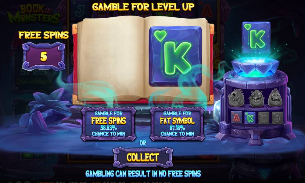 La ronda de tiradas gratuitas se activa cuando caen 4, 5, 6 ó 7 scatters en los rodillos en una tirada. Dependiendo del número de scatters, el jugador obtiene 5, 6, 7 u 8 tiradas gratuitas. Si el modo Ante Bet está activado, la bonificación puede activarse ya con 3 scatters, obteniendo 4 tiradas gratuitas. Antes de que comience la ronda, se abre Book Of Monsters, que selecciona aleatoriamente uno de los símbolos normales y lo convierte en un Fat Symbol. Los jugadores que tengan esta opción pueden pagar una cierta cantidad para intentar mejorar el símbolo seleccionado o conseguir tiradas gratuitas extra. Sin embargo, tenga cuidado: si aparece "The End" al intentar mejorar, la ronda de bonificación terminará antes de empezar.