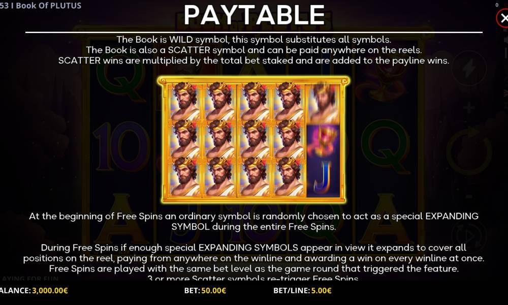 Una de las características de la tragaperras online "Book of Plutus" es la imagen del "Libro", que, como en otras tragaperras de este tema, sirve como comodín y símbolo Scatter. Esto significa que puede sustituir a todos los demás símbolos de los rodillos y proporcionarte ganancias de 2 a 200 veces tu apuesta.