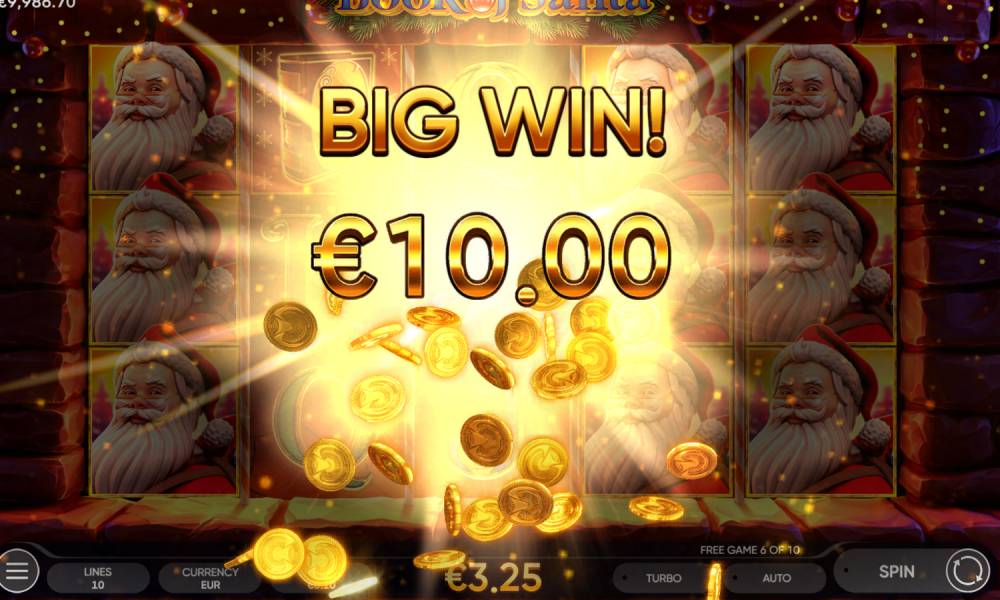 La tragaperras Book of Santa de Endorphina está dedicada al tema de la Navidad. Crea una atmósfera acogedora de velada festiva junto a la chimenea. La máquina contiene símbolos relacionados con la Navidad, como Papá Noel, estrellas y campanas, mostrando un ambiente cálido y de cuento de hadas. El campo de juego está diseñado en forma de chimenea rodeada de ladrillos rojos, lo que aumenta la sensación acogedora. La tragaperras online ofrece la mecánica clásica de pagos en las líneas, pero también complacerá con una interesante ronda de tiradas gratuitas con símbolos expansivos. Así que girar los rodillos será tan sencillo como emocionante.