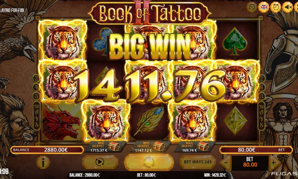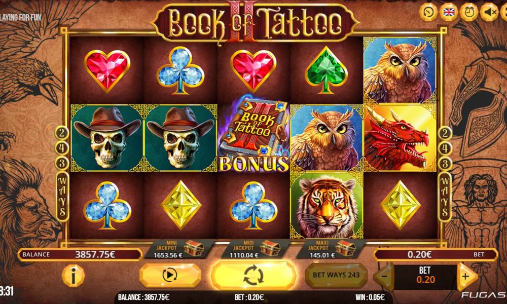 El campo de juego de la tragaperras Book of Tattoo 2 del proveedor Fugaso consta de 6 rodillos de 3 símbolos. Los pagos se realizan en 243 combinaciones posibles.