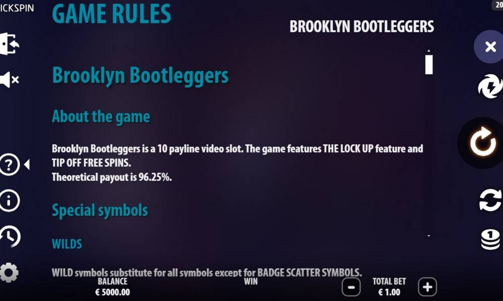 El juego Brooklyn Bootleggers se desarrolla en un campo con 5 rodillos en 3 filas y con 10 líneas de pago fijas. El tamaño de la apuesta puede cambiarse durante el juego y oscila entre 0,2 y 100 euros. Las combinaciones ganadoras se forman a partir de símbolos idénticos que aparecen uno al lado del otro en rodillos vecinos o en una casilla específica del campo. Los comodines y los símbolos de pago medio pueden dar una cierta multiplicación - hasta x10.000 - dependiendo del número de símbolos que aparezcan.