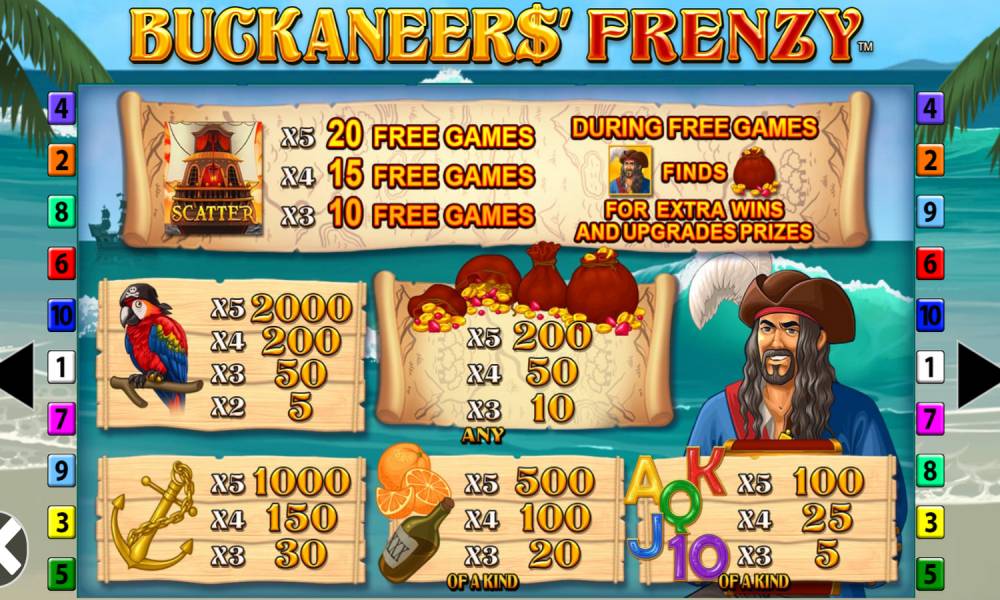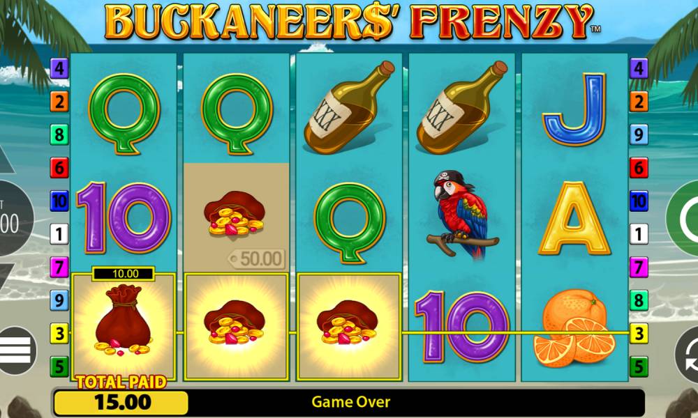Buckaneers' Frenzy es una tragaperras con 5 rodillos y 10 líneas de pago fijas. Para formar una combinación ganadora, debe reunir entre 3 y 5 símbolos idénticos empezando por el rodillo situado más a la izquierda. Los símbolos incluyen denominaciones de cartas tradicionales (A, K, Q, J, 10) e imágenes temáticas como una botella de ron, una naranja, un loro, un ancla y bolsas de botín. Hay un total de 5 tipos de símbolos de bajo y alto pago cada uno. El símbolo del loro es el más valioso y el único de todos que trae un pago de 2 piezas por línea. El juego también tiene signos especiales que activan funciones de bonificación y tiradas gratis. Las apuestas en las tiradas pueden ser de diferentes cantidades, desde 0,1 hasta 10 euros. Los usuarios pueden obtener grandes ganancias de hasta x50000 de la apuesta.
