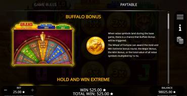 Bono Búfalo. Esta es la rueda de la fortuna. Existe la posibilidad de activarla en cualquier aparición de incluso 1 símbolo de Valor en tiradas simples. El jugador puede conseguir 1 de 4 premios: lanzar la ronda Hold And Win Extreme, botes Mini o Major, o un pago. El pago es igual a la suma de los multiplicadores de los símbolos Value que activaron el KF. Existe la posibilidad de que esta cantidad se multiplique por un número aleatorio entre 1 y 5.