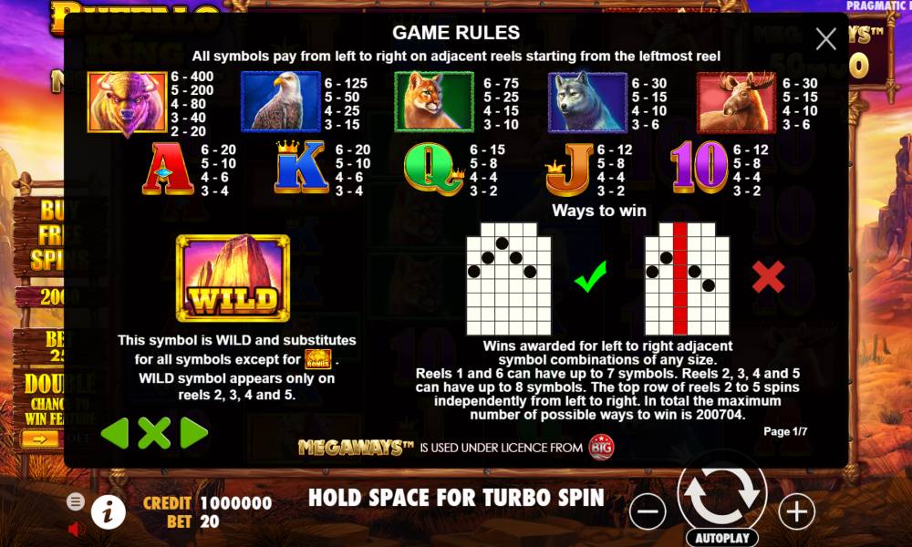Pruebe la tragaperras Buffalo King Megaways de Pragmatic Play sin riesgo alguno directamente en nuestro sitio web. Para ello, inicie el modo demo y disfrute del juego por dinero condicional.
