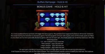 La tragaperras Buffalo Rampage - Hold & Hit continúa la legendaria y merecida serie de juegos, en la que el proveedor Spinomenal aplica casi todas las mecánicas desarrolladas sucesivamente. Además de temas familiares en la máquina tragaperras los usuarios esperan: gráficos mejorados, excelentes bonos y ganancias de hasta x5000 de la apuesta.