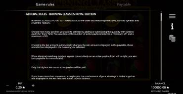 Clásicos en llamas: Royal Edition tiene un campo con una cuadrícula de 5x3. La mecánica de pago es clásica: por líneas, de izquierda a derecha, cada una debe tener un mínimo de 3 símbolos simples idénticos. Por defecto hay 20 líneas, pero su número puede reducirse a 1. Los diagramas de líneas se dibujan en la sección Paytable (haga clic en el botón de menú para entrar). En el juego intervienen un total de 9 signos. De ellos, 7 son simples, el resto tienen propiedades especiales. Además de las tiradas habituales, la tragaperras dispone de tiradas gratuitas, ronda de riesgo y símbolos apilados.