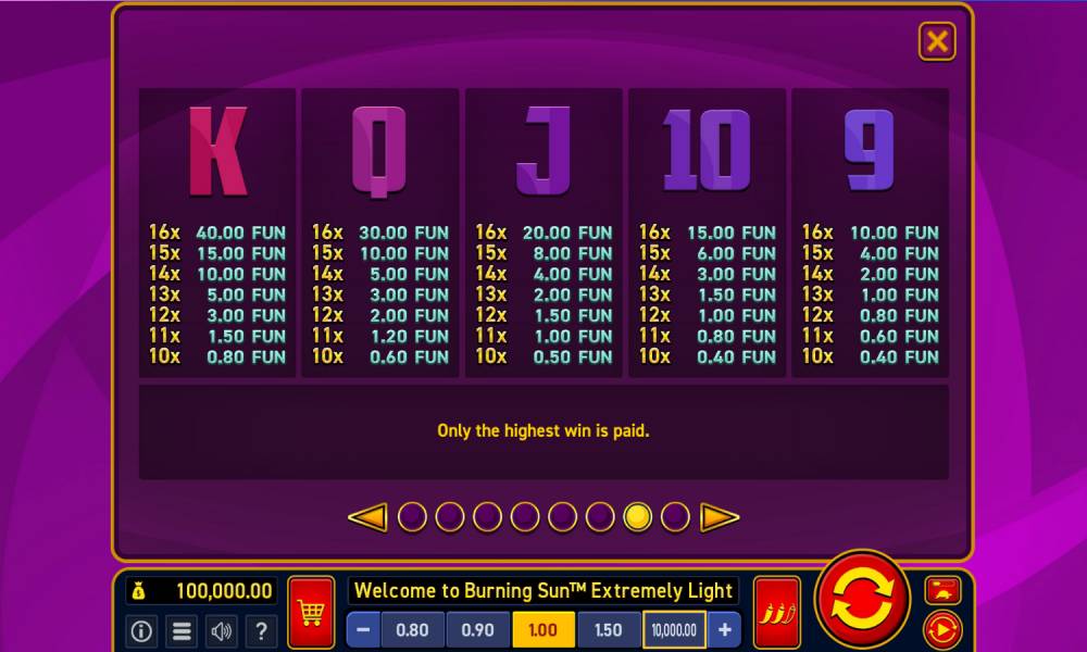 El proveedor Wazdan nos ha brindado una oportunidad única de jugar a la tragaperras online Burning Sun Extremely Light. Demo es muy importante para los nuevos jugadores o incluso los jugadores experimentados que aún no han visitado la ranura. La demo te permite conocer la tragaperras, sus reglas, bonos y tabla de pagos de la forma más segura y sin gastar dinero.
