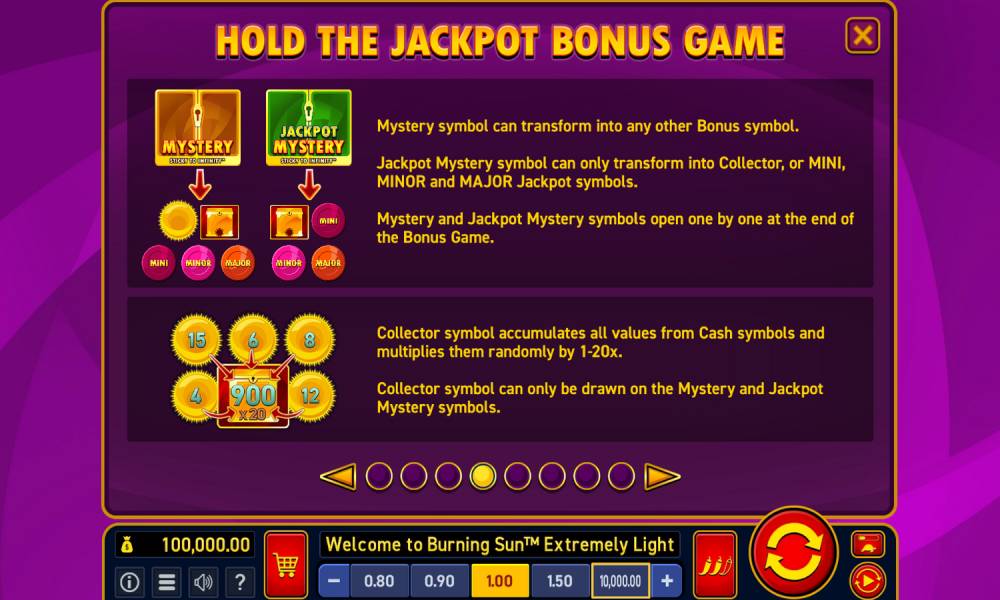 La tragaperras Burning Sun Extremely Light cuenta con botes que se pueden ganar a través de la función de bonificación Hold the Jackpot.