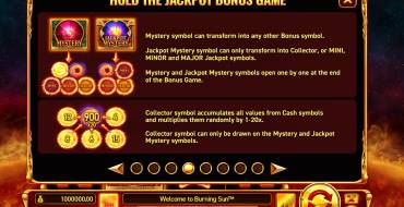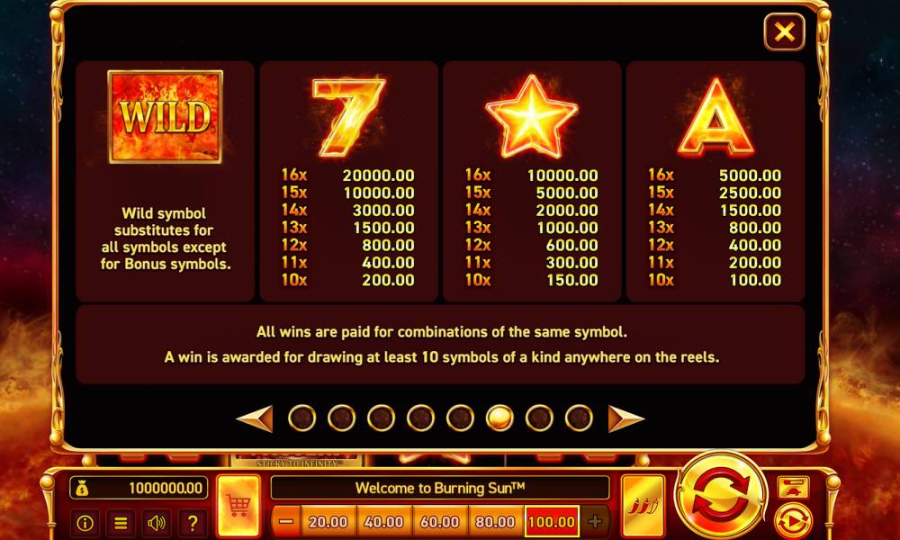 La tragaperras Burning Sun de Wazdan utiliza una cuadrícula de 4x4 con Pay Anywhere, lo que significa que sólo necesitas reunir entre 10 y 16 símbolos idénticos en cualquier lugar de la pantalla para ganar. No hay líneas de pago fijas en el juego, lo que hace que el proceso sea más flexible. La apuesta máxima en el momento de jugar alcanza las 10000 monedas, y la apuesta mínima es de sólo 0,2 monedas. Mientras que las ganancias máximas alcanzan, tanto como 5000x veces la tasa especificada. Para activar la ronda de bonificación Hold the Jackpot es necesario atrapar 6 símbolos de bonificación. Se fijan en los rodillos hasta la siguiente tirada si hay 4 o 5 de ellos en la pantalla. También están disponibles los símbolos especiales Sticky to Infinity que permanecen en los rodillos hasta el final de la ronda de bonificación, revelándose al final del juego. La tragaperras también ofrece la oportunidad de doblar sus ganancias a través del juego de riesgo, lo que añade un elemento de emoción.