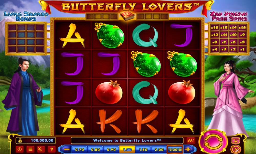 The Butterfly Lovers es una tragaperras con un campo de juego que es 4x4. Donde hay 4 filas de juego y 4 rodillos de juego. Las combinaciones se forman cuando los símbolos coinciden en cualquier lugar de los rodillos, ya que la tragaperras funciona con un sistema Pay Anywhere. El juego cuenta con una variedad de símbolos, incluyendo comodines, así como varios juegos de bonificación. Las principales bonificaciones incluyen tiradas gratuitas de Zhu Yingtai con un multiplicador de hasta 16x y un modo de bloqueo de símbolos. Las apuestas van desde 0,2 monedas hasta 10.000 monedas. Las combinaciones ganadoras dependen del número de símbolos idénticos que caigan en los rodillos. También hay un juego de riesgo que le permite doblar sus ganancias si adivina el color correcto de la carta. La ganancia máxima durante el juego alcanza 1600x de la cantidad apostada.