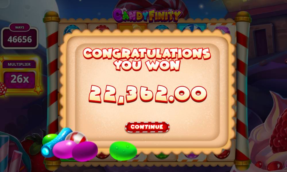 A principios del verano de 2023, Yggdrasil Gaming añadió otra tragaperras a su colección de tragaperras "de caramelo": Candyfinity. El brillante diseño, el enorme (x38837) multiplicador máximo y el mismo enorme número de líneas de pago (hasta 46656), el campo que aumenta de tamaño con cada pago - estas son las principales ventajas de la ranura. Debido a la altísima volatilidad, las ganancias caen muy a menudo, y el respin con campo creciente se activa con regularidad. Esto añade interés al proceso y también aumenta las posibilidades de que el jugador consiga un premio mayor.