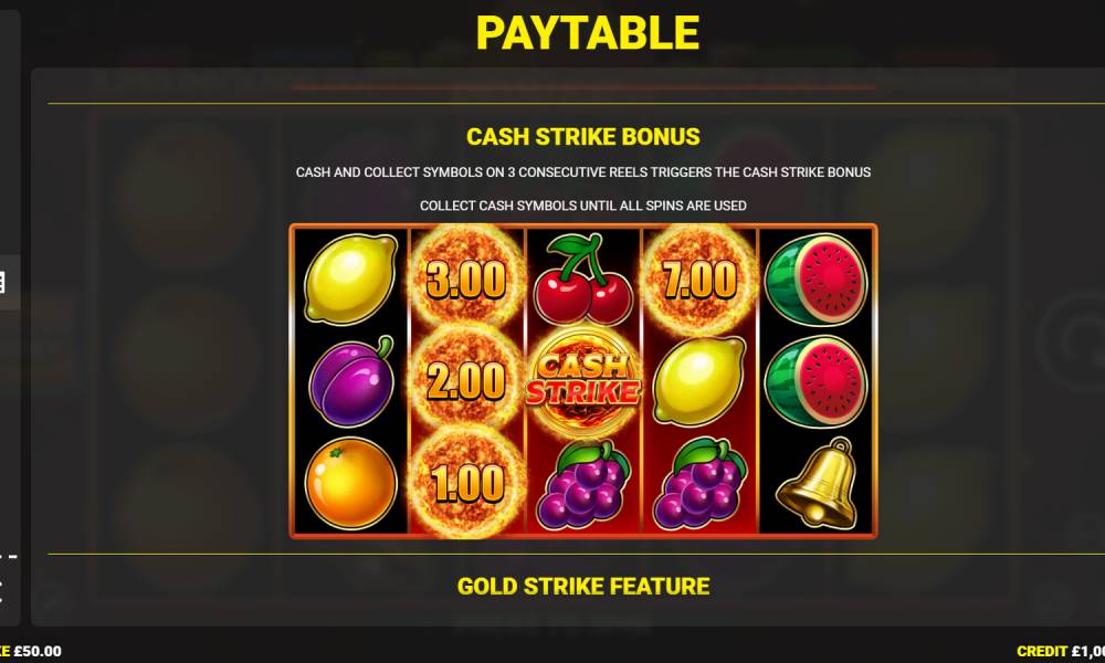 Función Gold Strike. Todos los Símbolos de Dinero que no han dado premio se recogen en una gran bola de fuego sobre los rodillos. En un momento aleatorio, explota. Los símbolos que faltan para iniciar la ronda de bonificación Cash Strike aparecen en el campo. Algunos de los valores en efectivo presentes aumentan de tamaño.