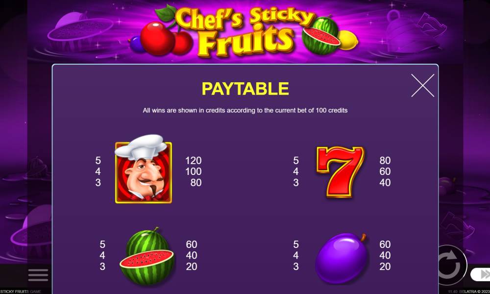 El conjunto básico de reglas de la tragaperras Chief's Sticky Fruits, como en todos los juegos clásicos, no difiere mucho del estándar. El campo de juego consta de 5 rodillos con una altura de 4 casillas. No hay tiradas gratis ni respins, ni tampoco otras bonificaciones con la excepción de Glued Reels. Los símbolos son las frutas habituales, sietes con barras. Total de los signos habituales 11 piezas y 1 especial. La apuesta la elige el jugador entre 0,25 y 250 euros. El conteo de símbolos es de izquierda a derecha en 100 líneas de pago fijas. Para formar una combinación se requiere la caída de 3 símbolos o más seguidos. Las ganancias máximas están limitadas a x1000 de la apuesta, lo que está bastante bien con una volatilidad suave.