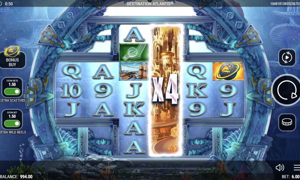 Es hora de mojarse los pies, ya que nuestro próximo destino es la legendaria ciudad de Atlantis. La tragaperras de 6 rodillos te permite transportarte a la mítica metrópolis a través de un antiguo portal mágico, que también actúa como fondo principal de los rodillos.