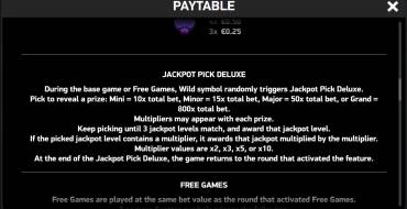 Existe la posibilidad de ganar 4 Jackpots en la tragaperras - Mini (x10), Minor (x15), Major (x50), Grand (x800). El sorteo tiene lugar en una ronda Jackpot Pick Deluxe independiente. Existe la posibilidad de activar la ronda en tiradas simples y tiradas gratuitas. Si la ronda se inicia - el jugador en cualquier caso ganará alguno de los botes. Si la ronda se inicia en tiradas gratuitas, tras su finalización el juego se iniciará en tiradas gratuitas con el número de tiradas restante.