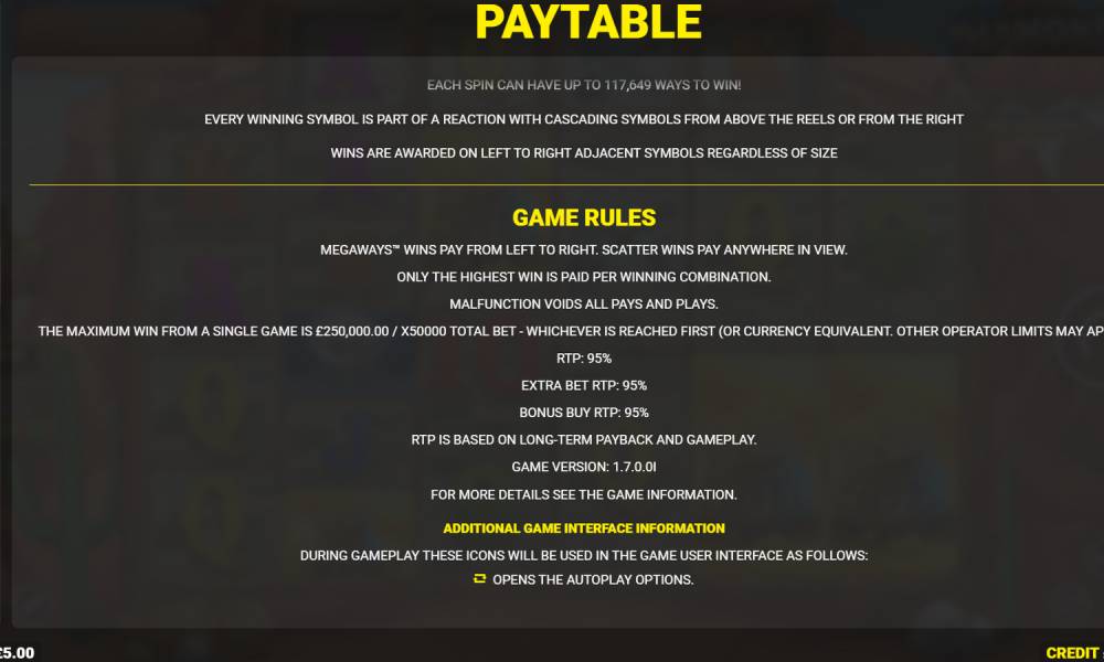 El campo de juego de la tragaperras consta de 6 rodillos verticales y un rodillo horizontal, que se encuentra encima de las columnas 2, 3, 4 y 5. La fila superior siempre consta de 4 casillas. Los rodillos inferiores pueden incluir un número diferente de posiciones. Debido a esto, el número de líneas ganadoras varía todo el tiempo, el máximo puede ser 117649. Debido a esta mecánica de Megaways, los usuarios pueden obtener más premios por tirada. El juego utiliza 6 símbolos menores y 4 mayores. Todos ellos dan premios a partir de tres piezas en una línea y sólo el diamante a partir de dos. Las cadenas de premios se hacen de izquierda a derecha desde el primer rodillo. La apuesta puede elegirse en el rango de 0,1-10 euros. Las ganancias serán más o menos frecuentes, por lo que incluso con pequeñas inversiones podrá acumular una cantidad decente. El premio máximo es x50000 de la apuesta, pero no más de 250000 euros. La tragaperras online tiene un bono de compra, multiplicadores, tiradas gratis, rondas extra y símbolos especiales.