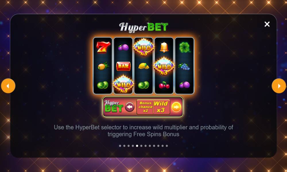 HyperBet. El jugador puede elegir sus propias condiciones de juego. En los parámetros básicos (nivel HyperBet 1) el comodín puede tener un multiplicador adicional x2, y la apuesta mínima por tirada es de 0,25. En HyperBet 2, la apuesta mínima es de 0,50, pero Wild puede tener un multiplicador adicional x3, y la posibilidad de obtener una tirada Bonus se duplica. Y en HyperBet Nivel 3, la apuesta no puede ser inferior a 2,50, Wild puede tener un multiplicador de x6, y la probabilidad de tirada de Bonus se incrementa a 4x las condiciones base.