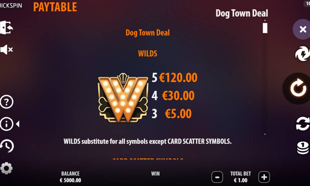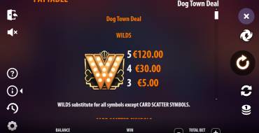 La tragaperras de vídeo Dog Town Deal cuenta con 5 rodillos en 3 filas y 20 líneas de ganancias fijas. Los pagos se conceden cuando se colocan símbolos idénticos en los rodillos en una fila de izquierda a derecha. La cantidad ganada está ligada al tamaño de la apuesta. El rango de apuestas va de 0,20 a 100 euros. La caída de 3 o más de los mismos símbolos da la oportunidad de aplicar un multiplicador a la apuesta, el tamaño específico de los multiplicadores se enumeran en la tabla de pagos. El multiplicador máximo x120 a la apuesta promete la aparición de 5 Wild.