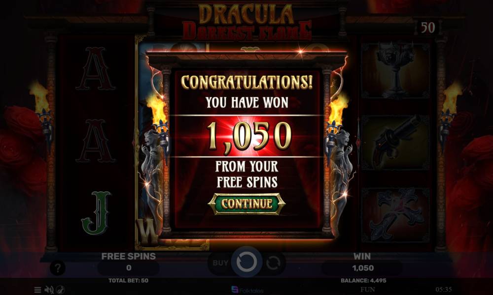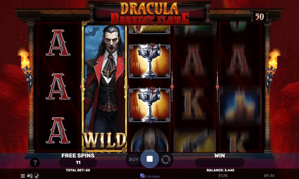 Drácula - Darkest Flame presenta una cuadrícula estándar de 5x3, con 50 líneas de construcción de combinaciones. Los símbolos se cuentan de izquierda a derecha, a partir de 3 iguales en fila. Gana exclusivamente la combinación más cara de la línea, el resto no se tiene en cuenta. En el juego intervienen 9 símbolos normales y 5 especiales. La volatilidad media con una ganancia máxima de x1000 hace que la tragaperras sea muy atractiva para todos los jugadores. La tasa se establece de 0,5 a 500 euros. La tragaperras se implementa giros gratis, Rueda de la Fortuna y otros bonos, y para cada uno hay disparadores apropiados.