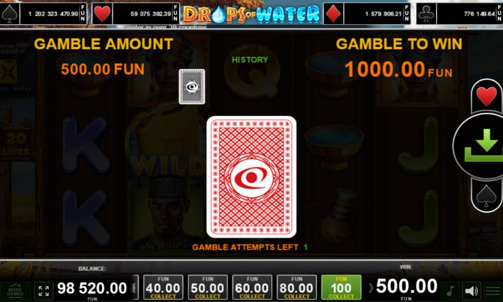 Apostar. Cuando la tirada termina con la recepción del premio, el usuario decide - cogerlo o intentar doblarlo. En el segundo caso, tiene que adivinar el color de la carta, eligiendo entre rojo y negro. La respuesta correcta duplica la apuesta, la incorrecta - la anula. No se puede adivinar más de cinco veces seguidas. También hay una cantidad máxima ganadora, se especifica en el menú.