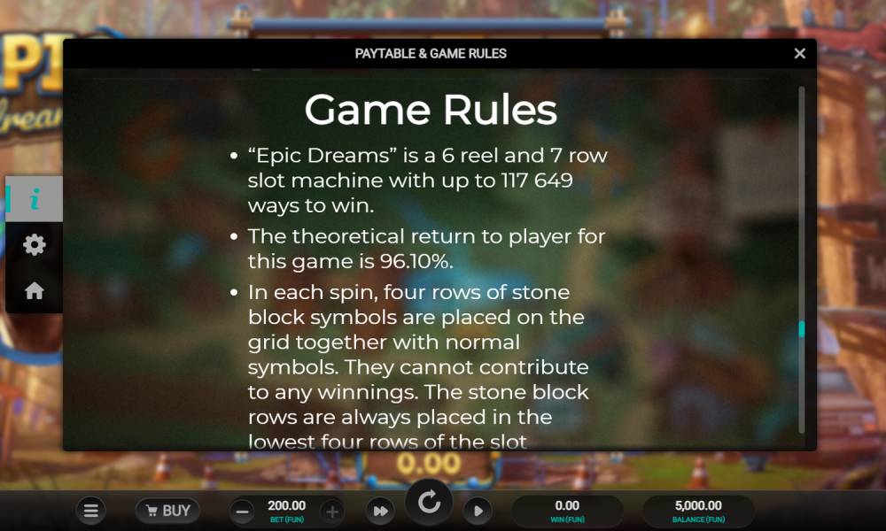 Justo al principio de la reseña, hay una versión demo de Epic Dreams. Es gratuita y no necesitas registrarte en ningún sitio para jugar. Así que puedes pasar rápidamente de la teoría a la práctica y evaluar la tragaperras por tu cuenta con la descripción de las reglas a mano.