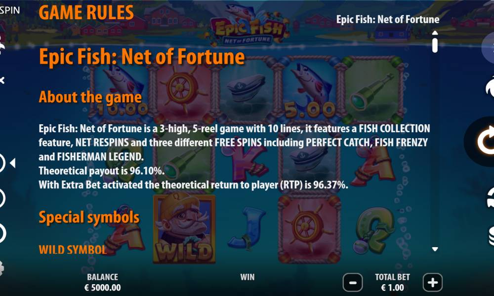 Una de las principales funciones de bonificación de la tragaperras Epic Fish: Net of Fortune son las tiradas gratis. Puedes leer más sobre las tiradas gratuitas en la sección Juegos de bonificación.