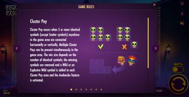 Función Avalancha. Comienza cuando aparece una combinación ganadora de símbolos o después de que el Comodín Explosivo caiga y explote. Después de eso, nuevos símbolos o los que estaban situados arriba caen en las casillas desocupadas. La función dura hasta una nueva ganancia o la aparición del Explosivo Wild.